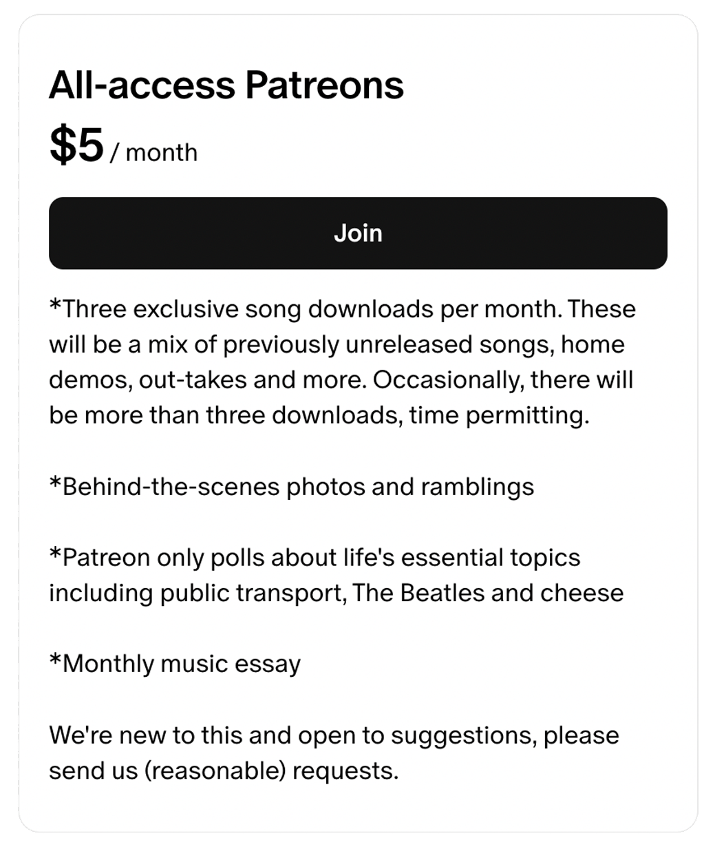 At present there are more than 50 exclusive recordings available for download for subscribers, with four new tracks being added each month. Each track comes with a description of the recording/ origin story.